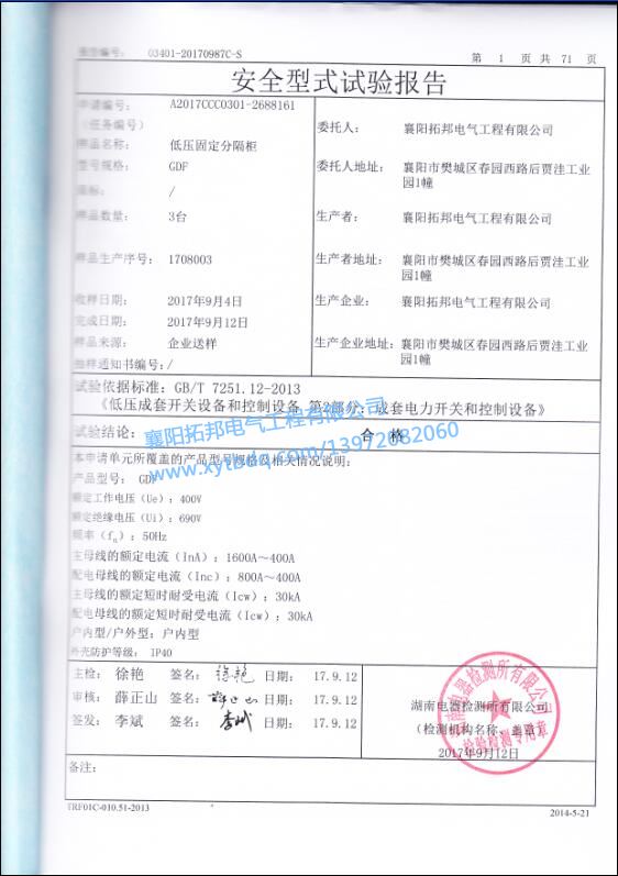 低壓固定分隔柜GDF 強制性產品 試驗報告