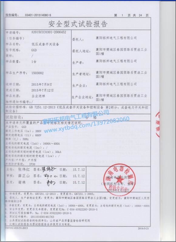 低壓成套開關設備GGD 強制性產品 試驗報告